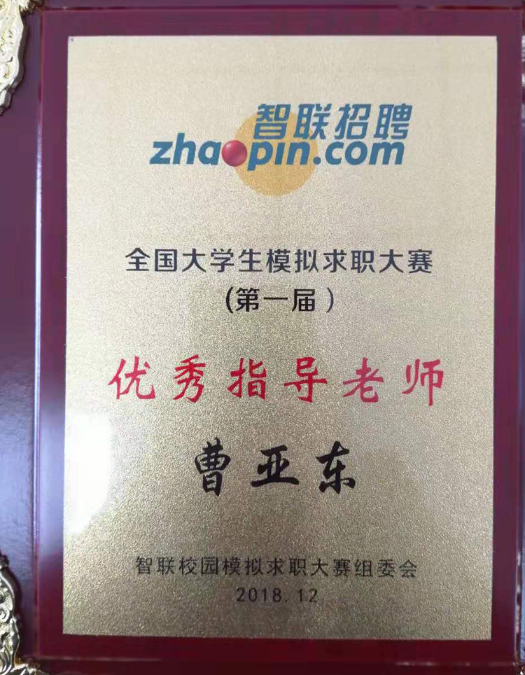 本站近日消息 近日,智联招聘对2018年12月举办全国大学生模拟求职赛的指导教师进行了评选,永利集团管理与新闻传播学院学院教师曹亚东教授获优秀指导教师称号。 2018年12月,智联招聘举办了校园首届全国大学生模拟求职赛,在辽宁赛区的比赛中,从全省高校选拔的30余名优秀选手参加决赛,比赛评选前三名及优秀奖五个,永利集团曹亚东教授指导的管理与新闻传播学院2018级学生申彩营获得第三名,管理与新闻传播学院2018级学生贠琬澂获得优秀奖。 新闻作者:招生就业处 李依巍 责任编辑:朱翠立 新闻日期:2019-03-12 点击:次